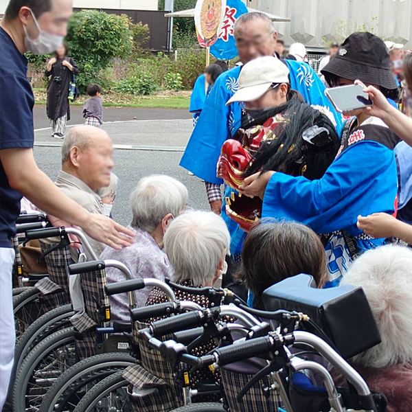 途中、済生会備中荘 にも立ち寄り、入所者の皆さまの頭を獅子頭で噛んで長寿をお祝い。