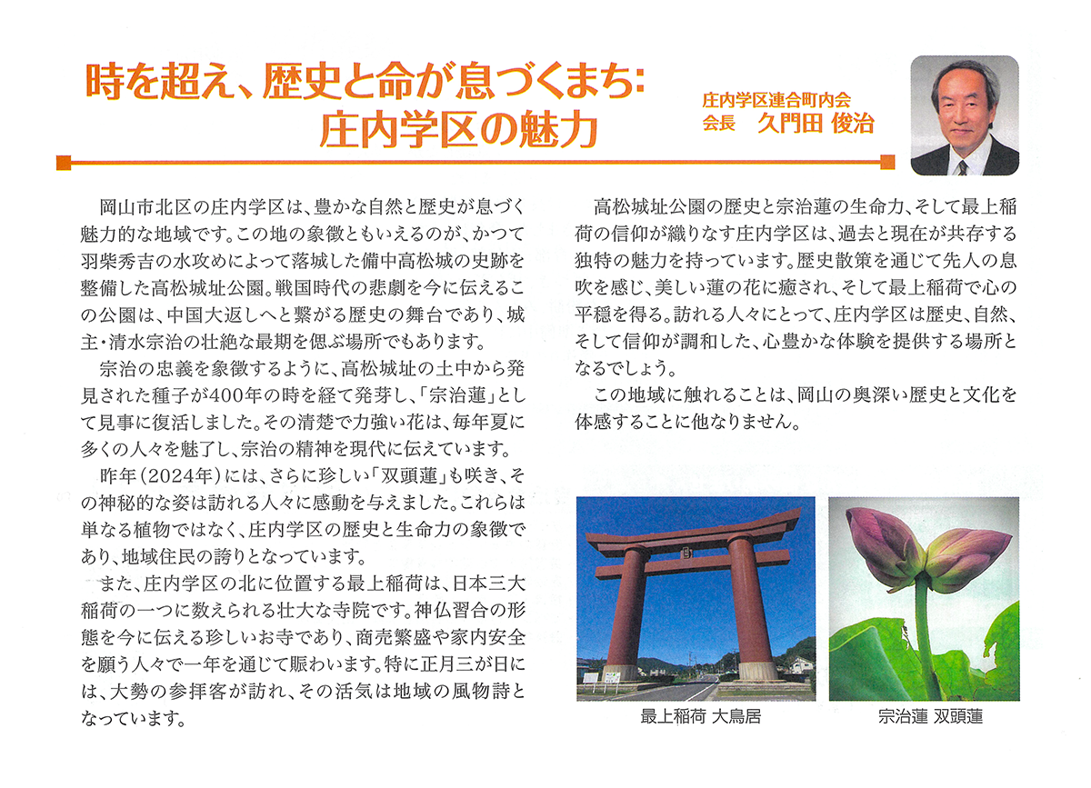 戦国時代から続く宗治蓮の物語、そして地域の象徴でもある最上稲荷の魅力などを紹介。